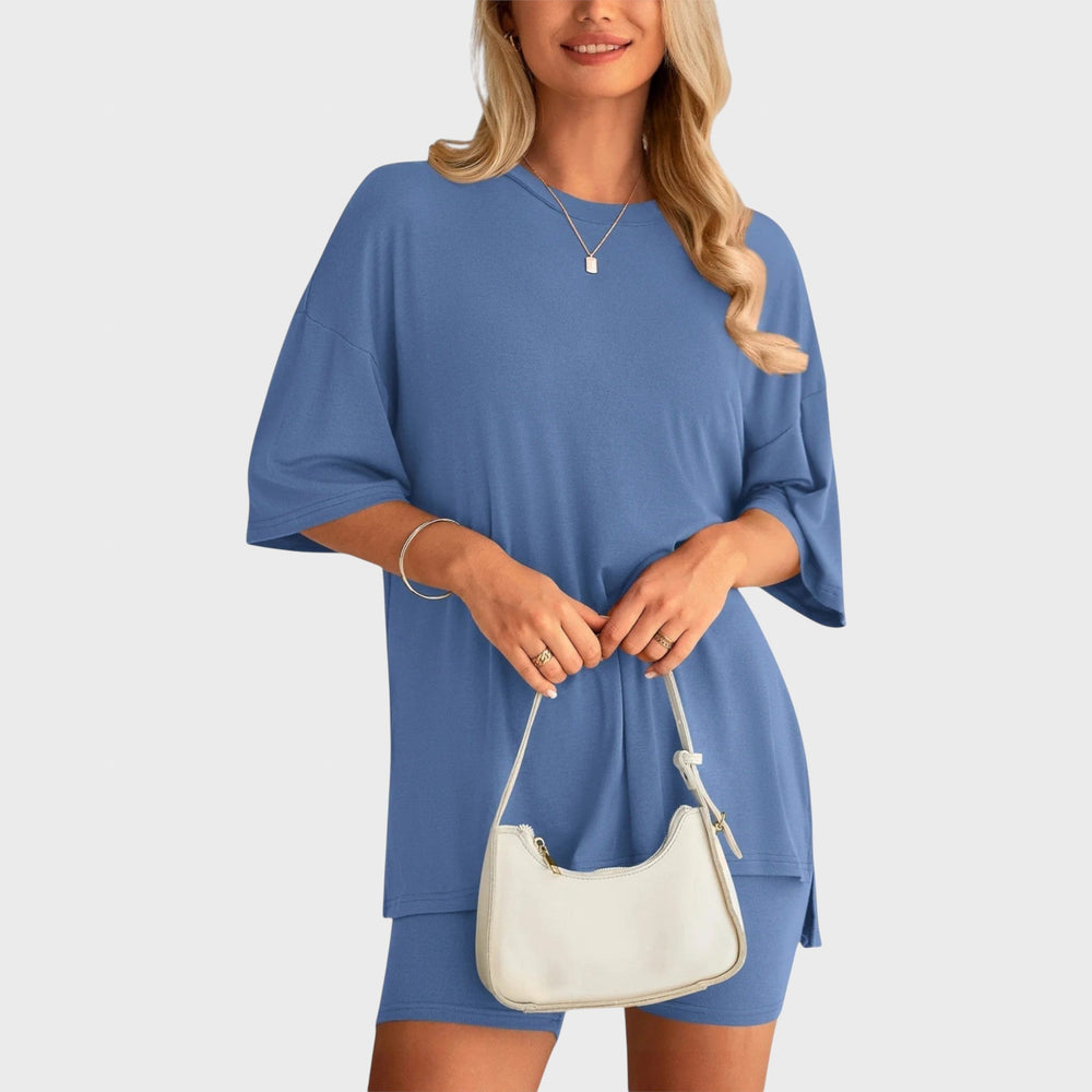 • Несравним комфорт и свобода на движение: комплектът съчетава свободна тениска с шорти с висока талия, осигурявайки удобно прилягане и неограничена свобода на движение за всяка дейност.