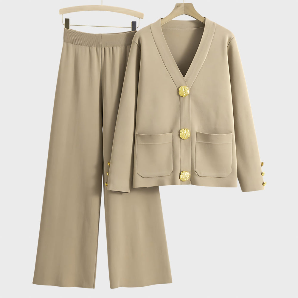 • Стил и комфорт: Комплектът съчетава жилетка с V-образно деколте и широки плетени панталони, които предлагат максимален комфорт и плавно движение, като същевременно запазват елегантност.