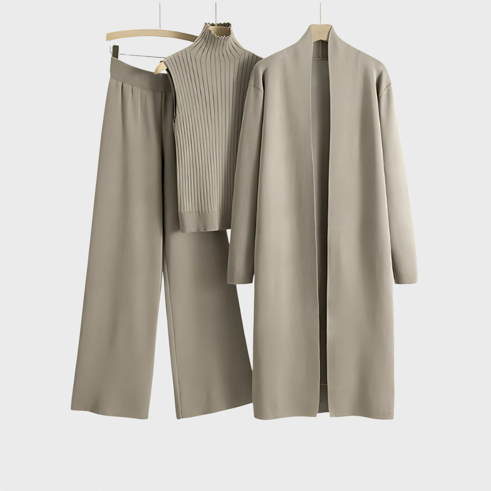 • Универсалност на наслояването: И трите части са задължителни и могат да се носят заедно, по двойки или поотделно. Дългото палто и оребреният топ са идеални преходни елементи, които могат да се носят върху или под други дрехи през всеки сезон.