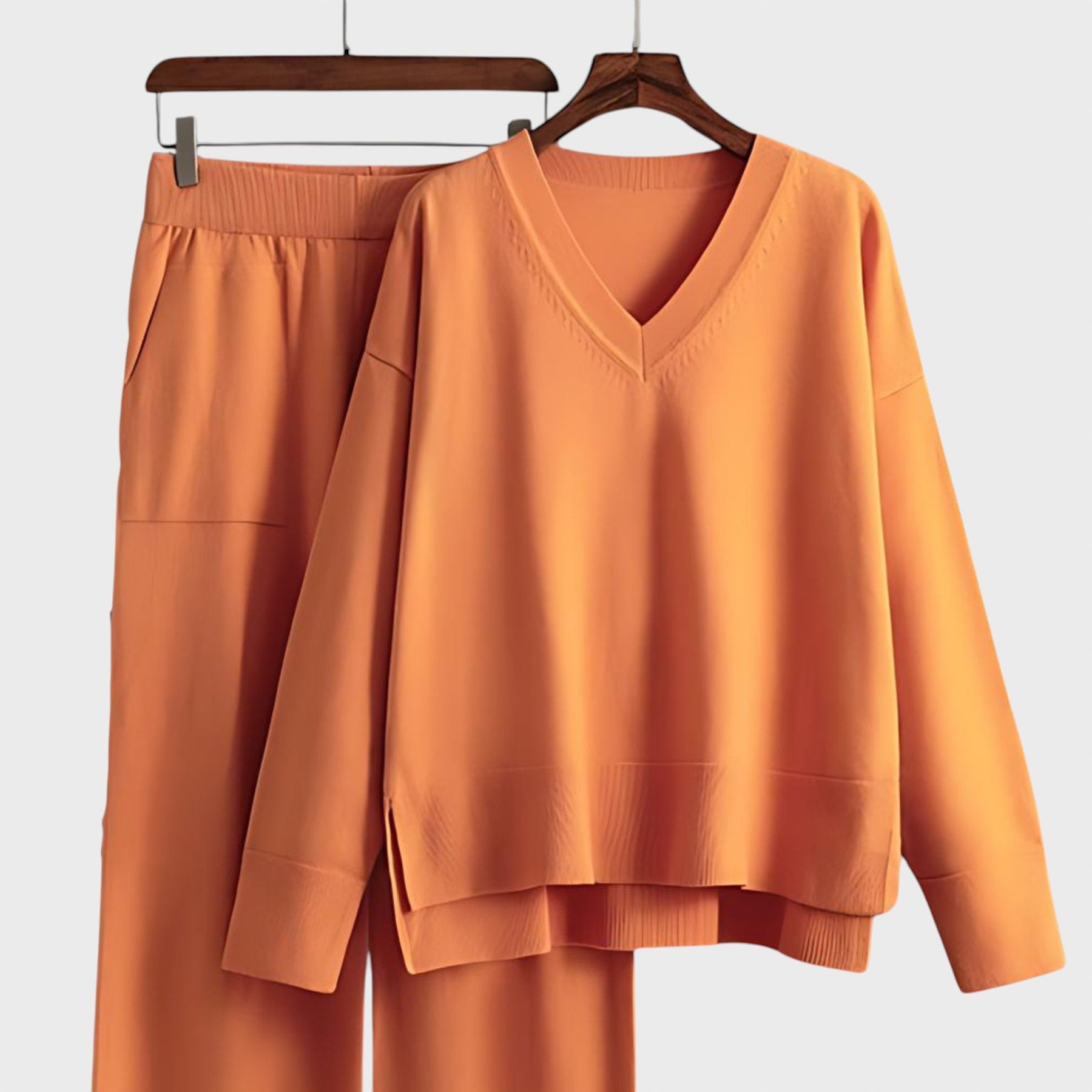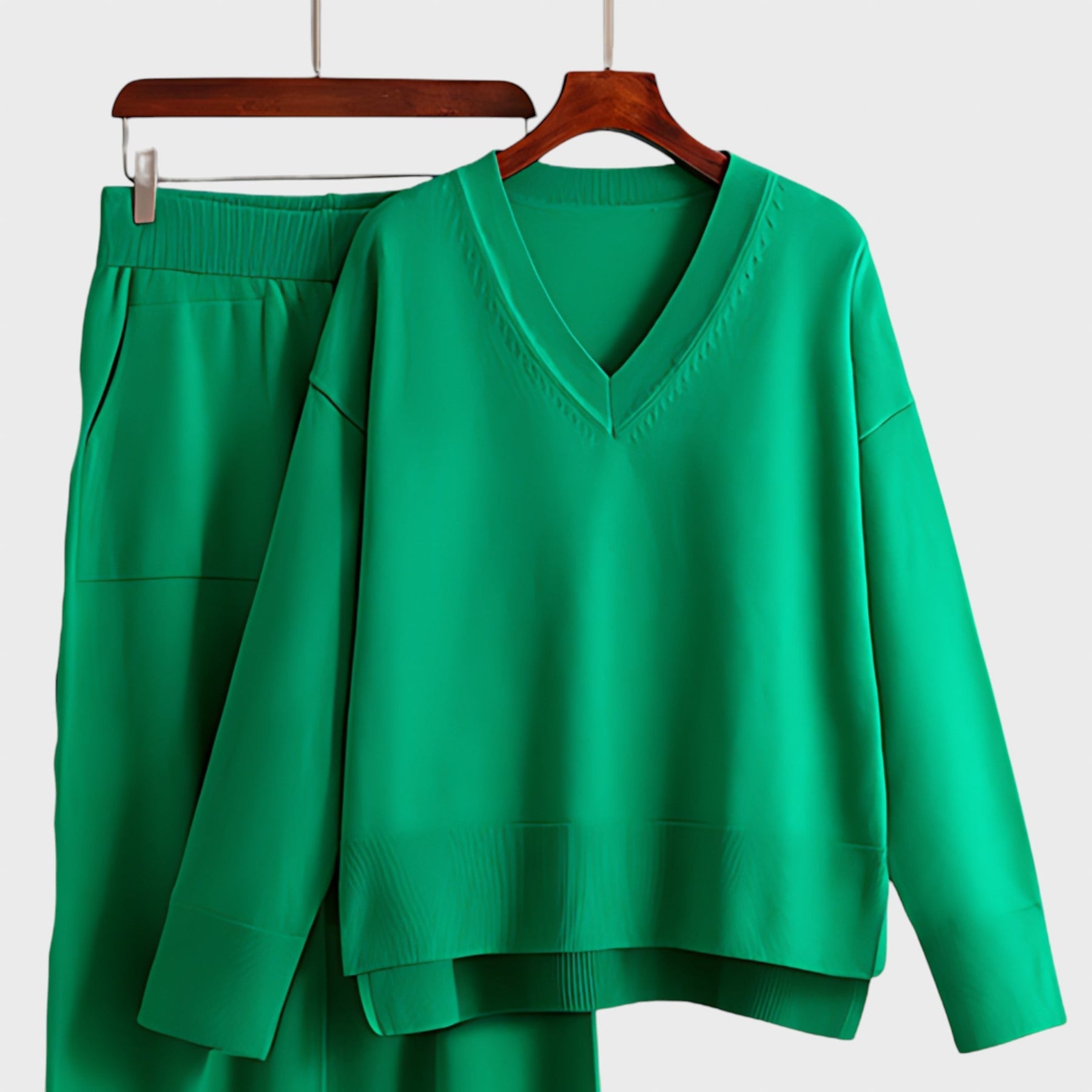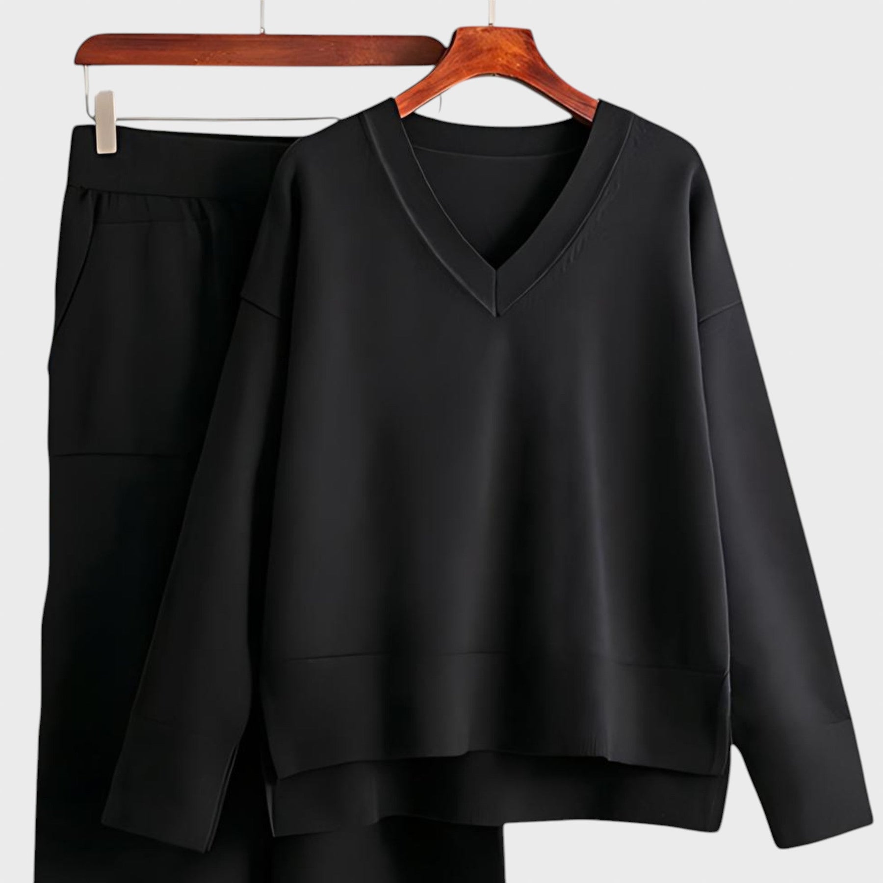 Изработен от смес от меки, дишащи материи, този комплект гарантира комфорт през целия ден, като същевременно ви прави стилни без усилие. Пуловерът с V-образно деколте и джогър панталонът с висока талия и връзки създават перфектната комбинация от ежедневна кройка и изискан стил. Свободният горнище и широките панталони предлагат ласкателен силует за всички типове тяло.
