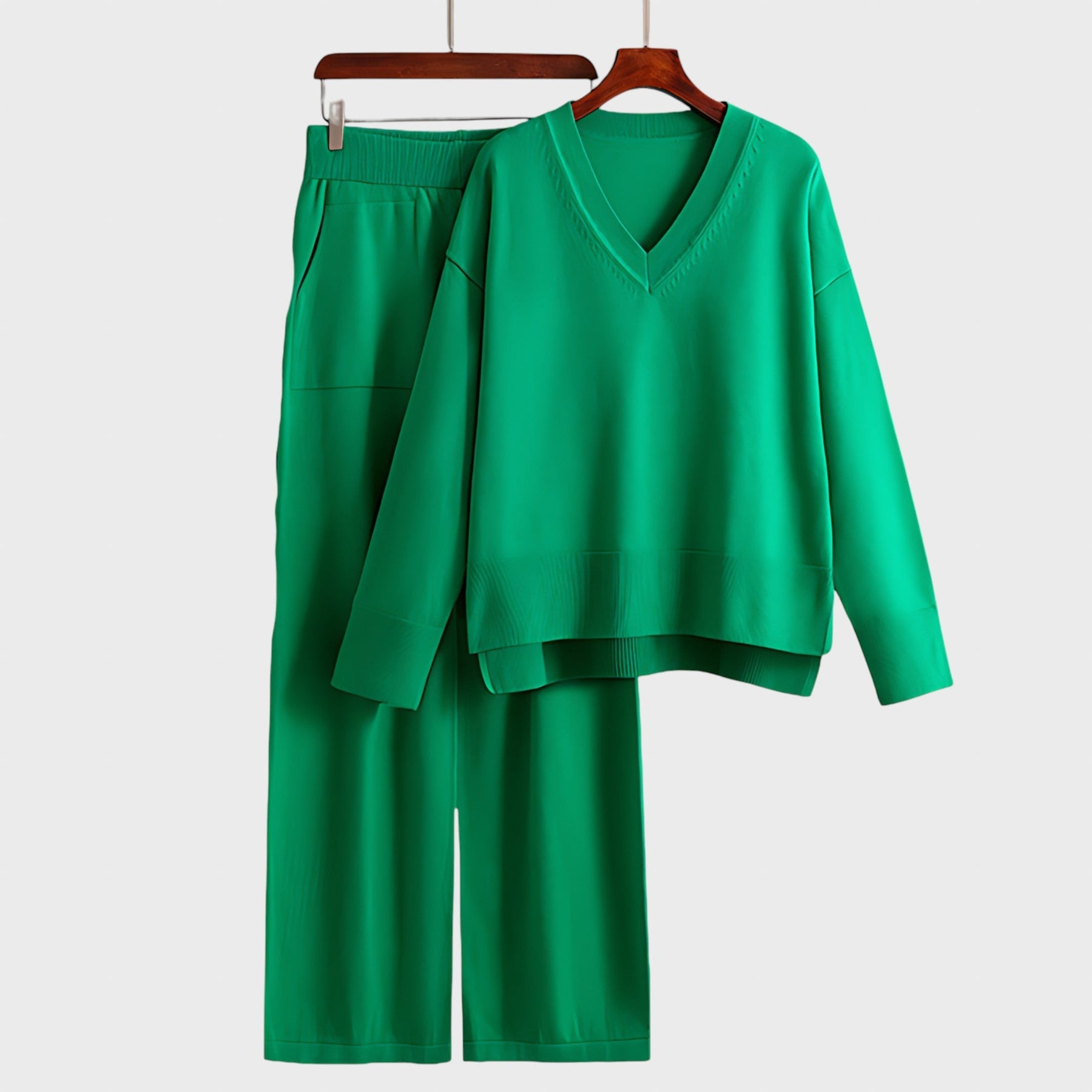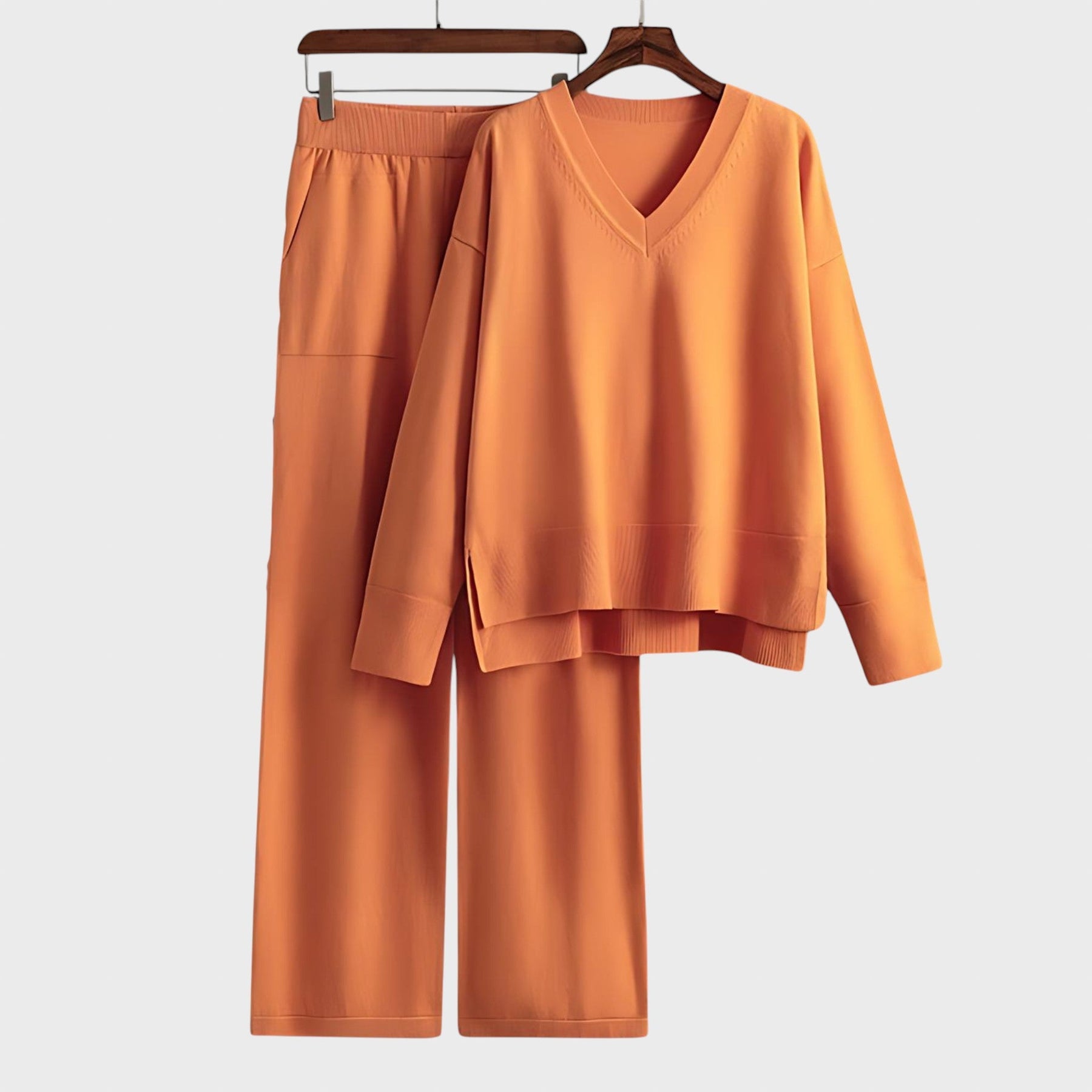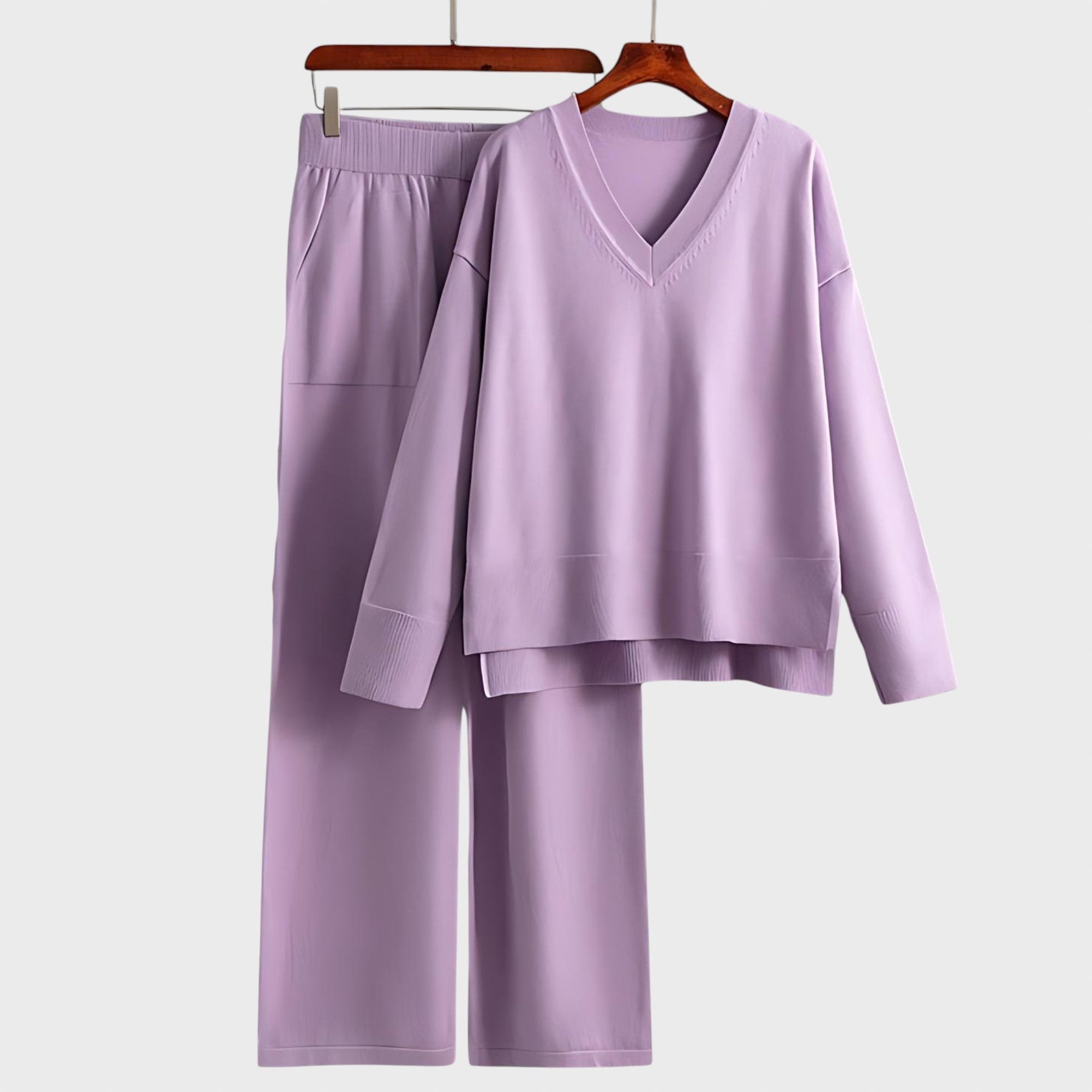 Изработен от смес от меки, дишащи материи, този комплект гарантира комфорт през целия ден, като същевременно ви прави стилни без усилие. Пуловерът с V-образно деколте и джогър панталонът с висока талия и връзки създават перфектната комбинация от ежедневна кройка и изискан стил. Свободният горнище и широките панталони предлагат ласкателен силует за всички типове тяло.