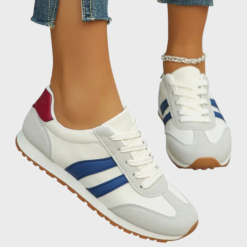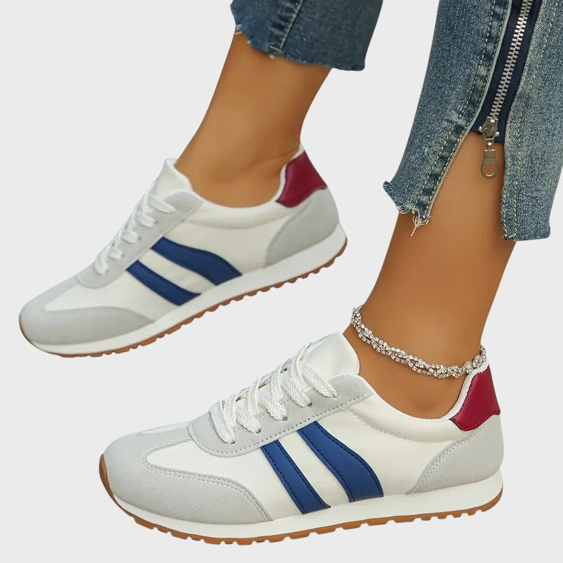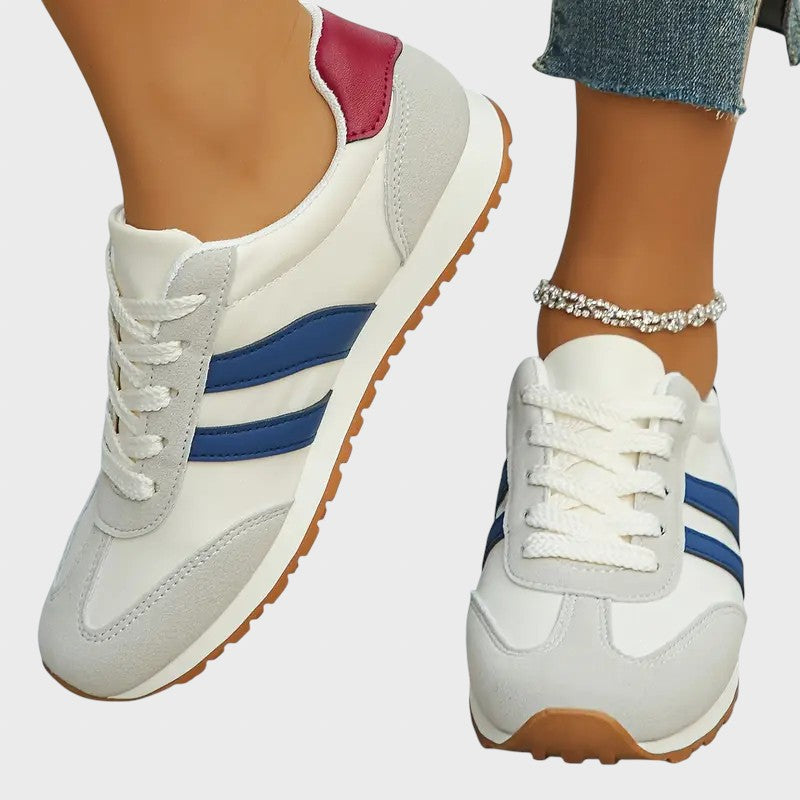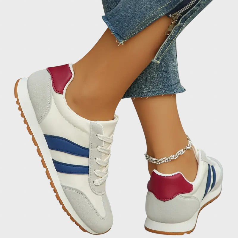 • Ярки контрастни детайли: Основната част в неутрални тонове е акцентирана от сини странични ивици и бордо или наситено червен детайл на тока.