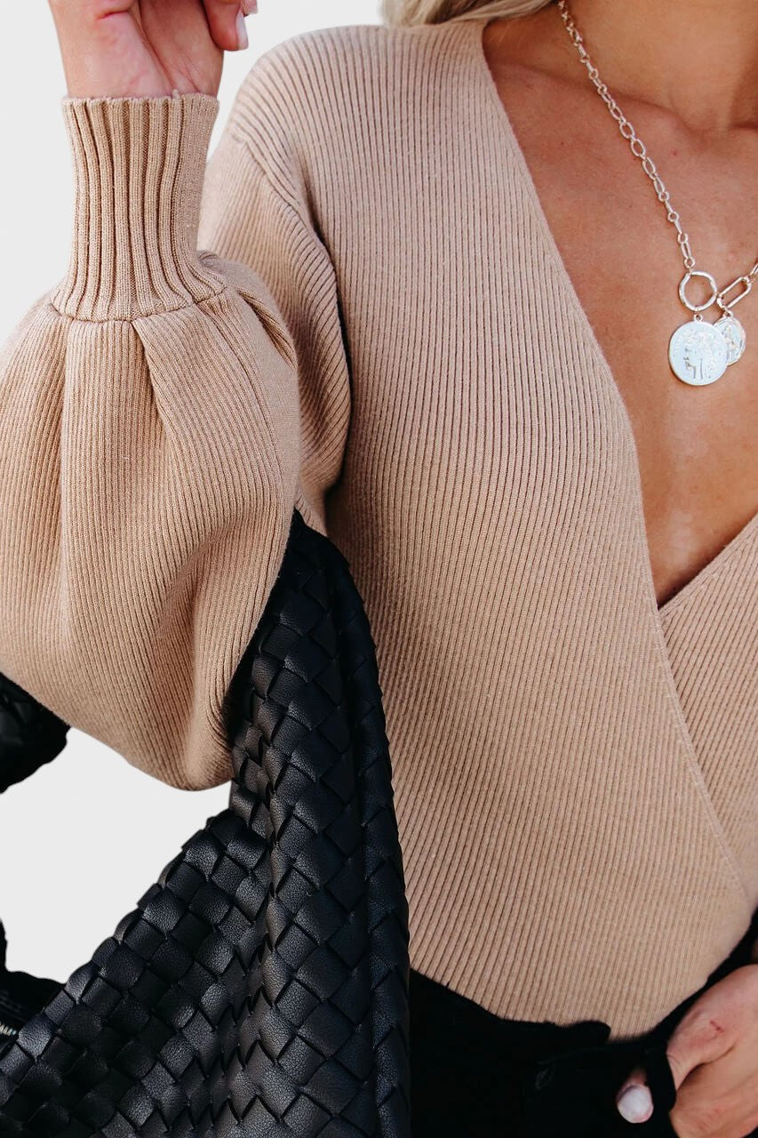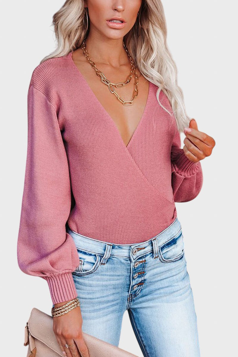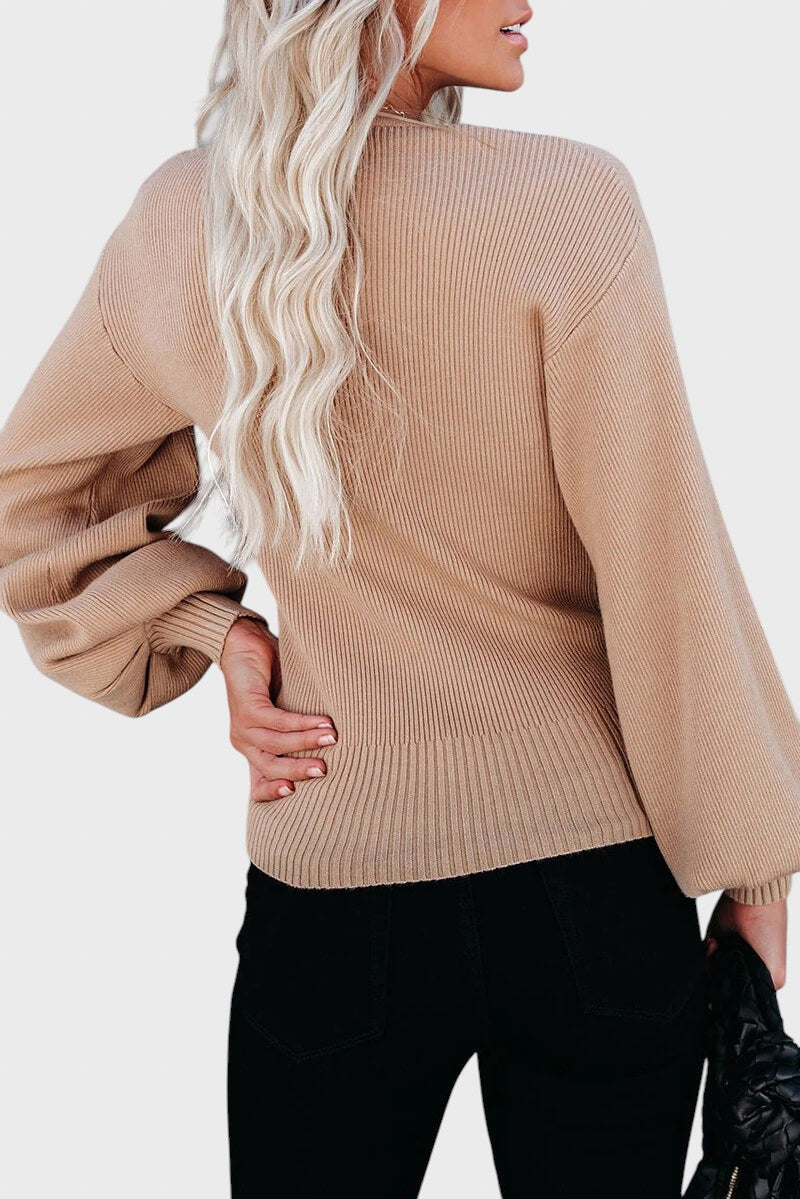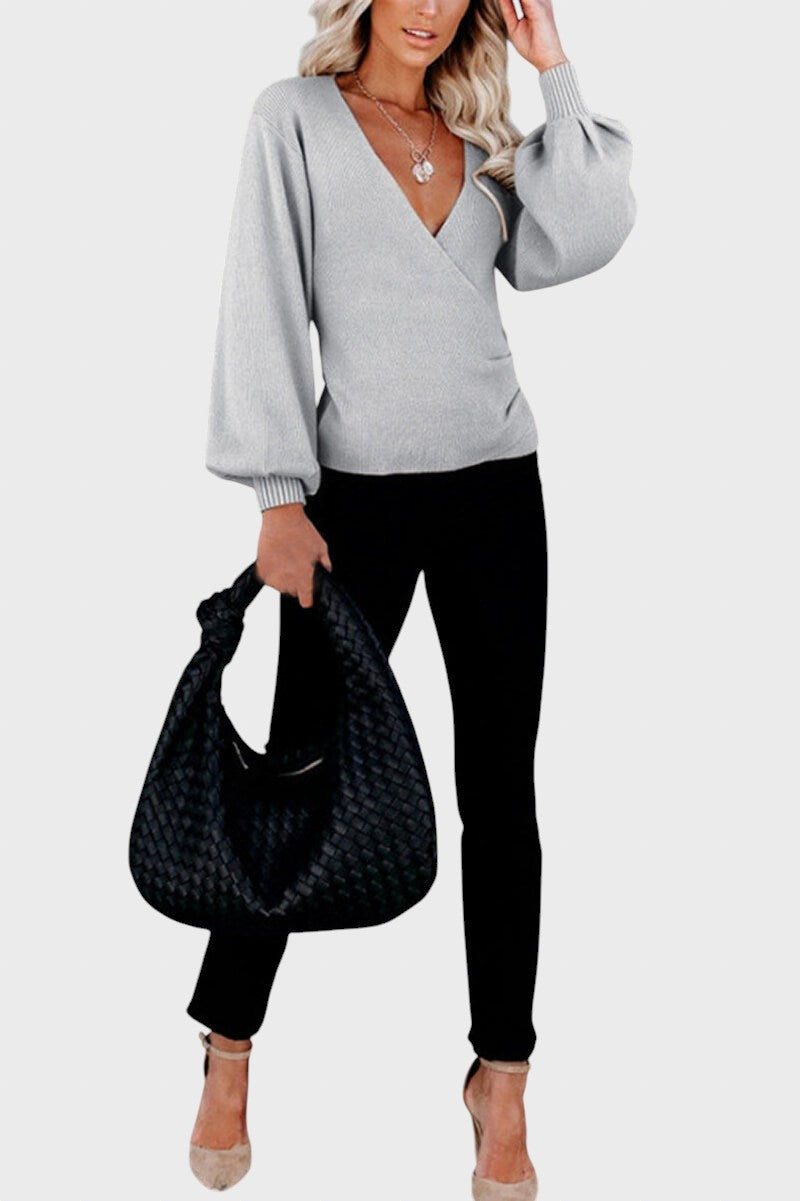 • Елегантност без усилие: Пуловерът се отличава с класическа и изискана кройка благодарение на прегъващия си дизайн с V-образно деколте. Този стил ласкае силуета. Балонните ръкави са елегантен и модерен детайл, завършващ с вталени оребрени маншети, които добавят структура към пълнотата на ръкавите.