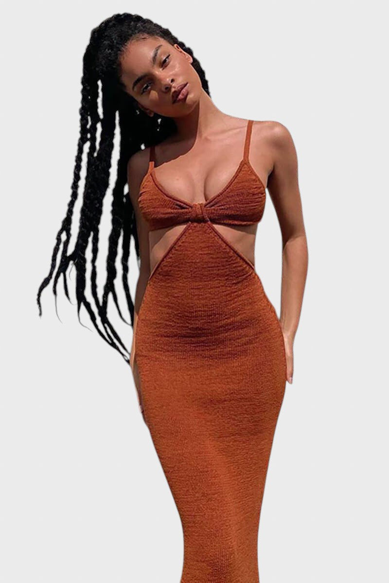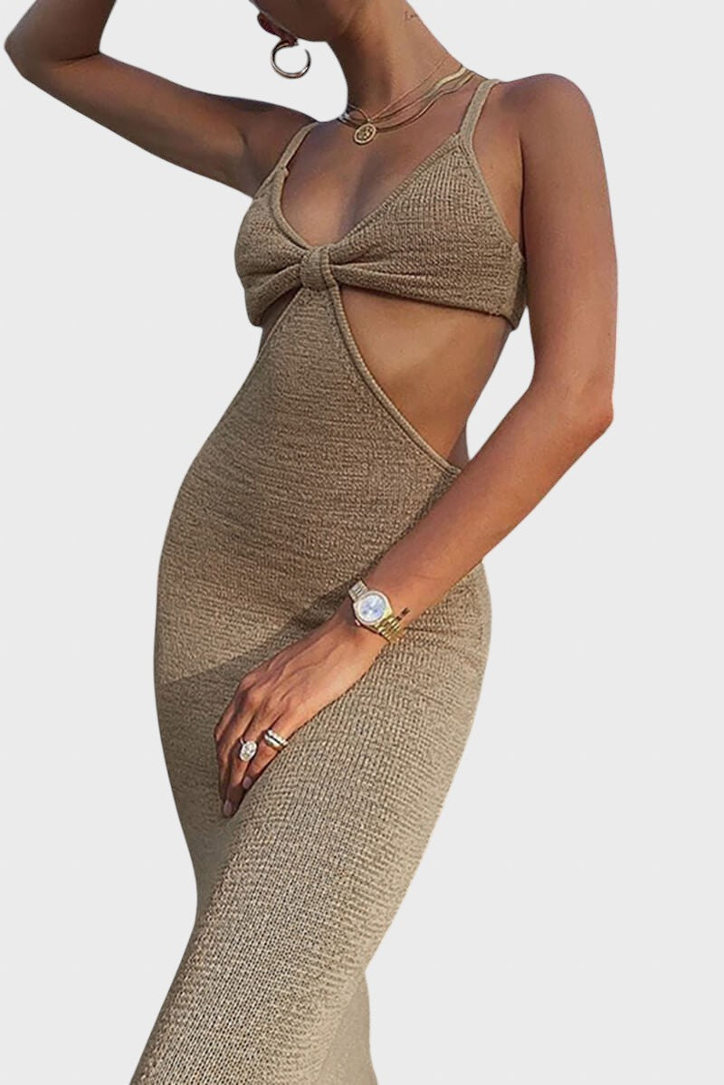 Прегърнете модерните тенденции с тази смела миди рокля, която съчетава уютната текстура на плетиво със чувствен дизайн с изрези. Освен че е шик, секси и перфектна за по-слънчеви дни, тя е с изрези на талията, които ще подчертаят фигурата ви.