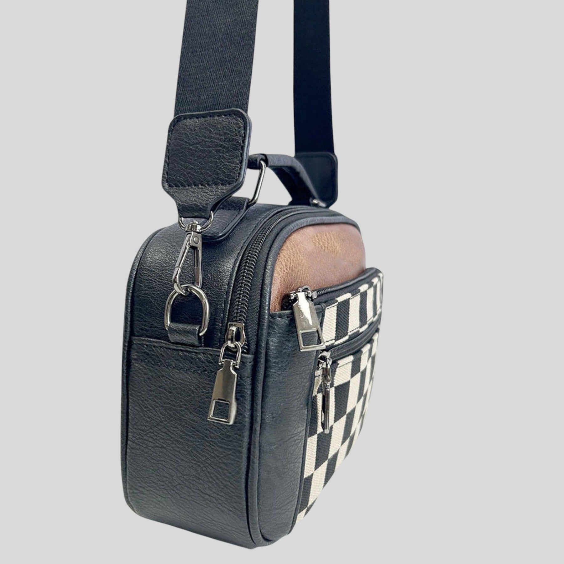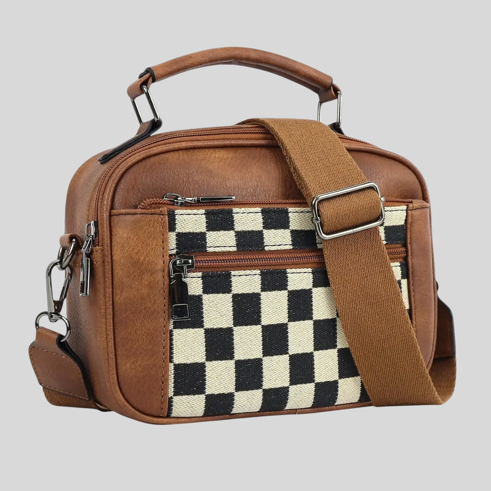 Този практичен и стилен куфар е идеалният спътник за вашето ежедневие. С модерен дизайн и отличителен кариран мотив отпред, той добавя нотка индивидуалност към всяка визия. Регулируемата презрамка и просторният интериор осигуряват функционалността, от която се нуждаете.